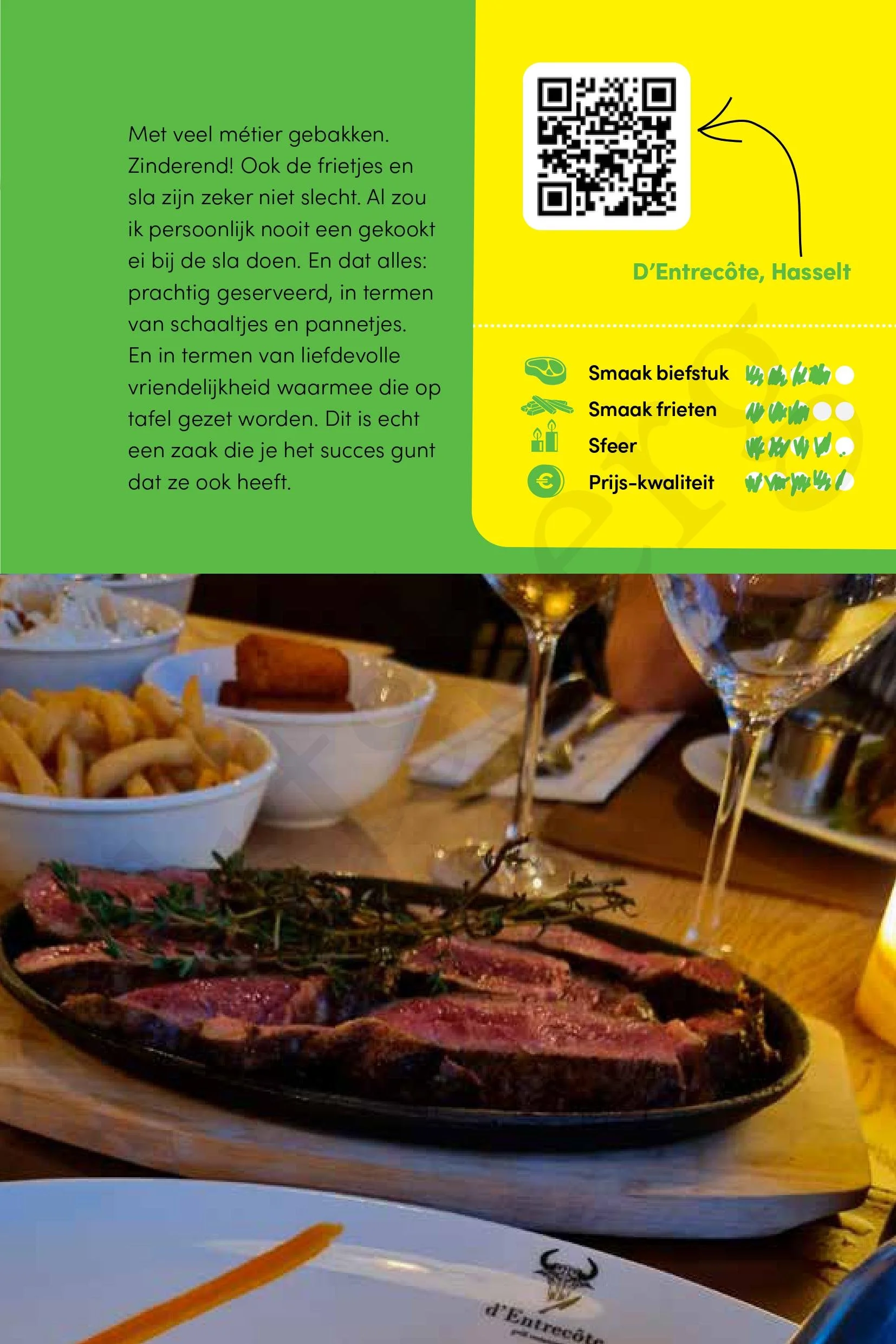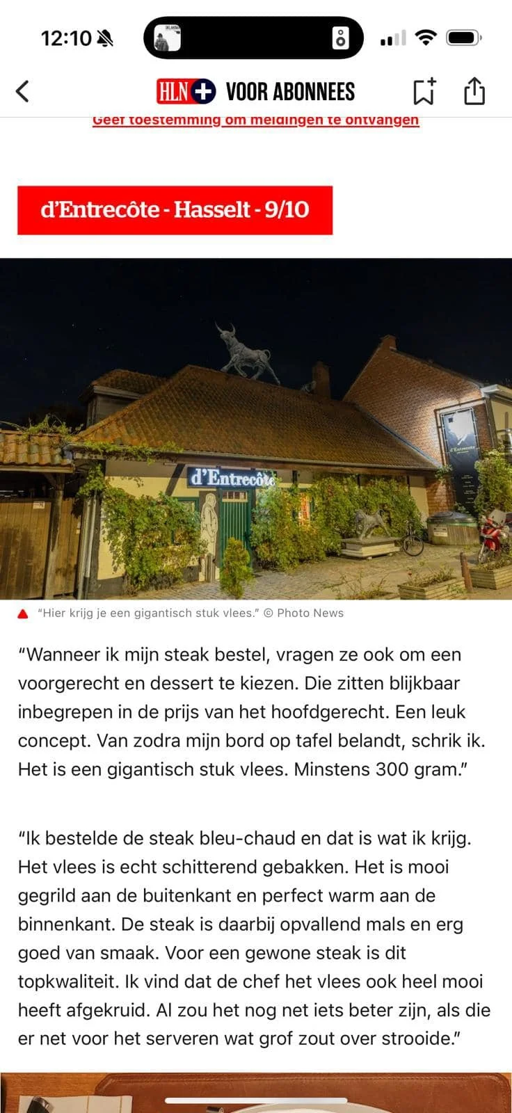 Als slagerszoon klopt mijn hart nog altijd het meest voor vlees en dus kan je me hopelijk dit weekend al terugvinden in d’Entrecôte, met voorsprong het beste vleesrestaurant van Limburg en omstreken. Met gelukkig twee filialen - één in Borgloon en één in Wimmertingen bij Hasselt - én allebei een terras, zodat ik er hopelijk vandaag of morgen al de benen onder tafel kan schuiven. Al moet ik voorlopig nog genoegen nemen met een plaats op de wachtlijst. Allez, op beide lijsten, want ik snak er zo hard naar… Ga naar het artikel